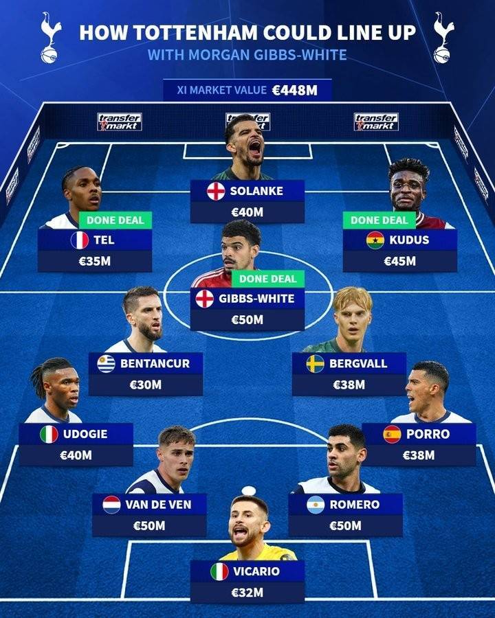 直播吧7月12日讯 热刺今夏连续敲定特尔、库杜斯和吉布斯-怀特,《转会市场》也预测了热刺新赛季的主力阵容。